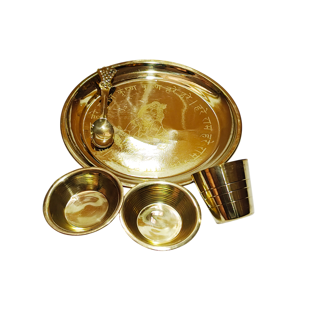 brass bhog thali set,5 piece pooja plate,gold plated thali,home temple decor,iskcon pooja plate,devotional offering set,durable brass thali