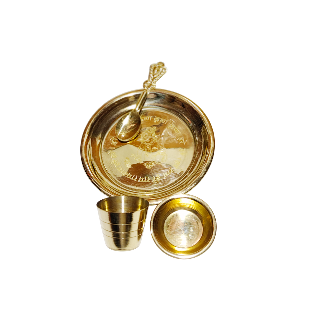 Invite divine radiance into your home temple with our Golden Brass Pooja Thali—a beautifully crafted devotional plate inspired by traditions of Vrindavan. This small but graceful thali is perfect for offering bhog, incense, or flowers during daily puja, or for adorning the altar with elegance.