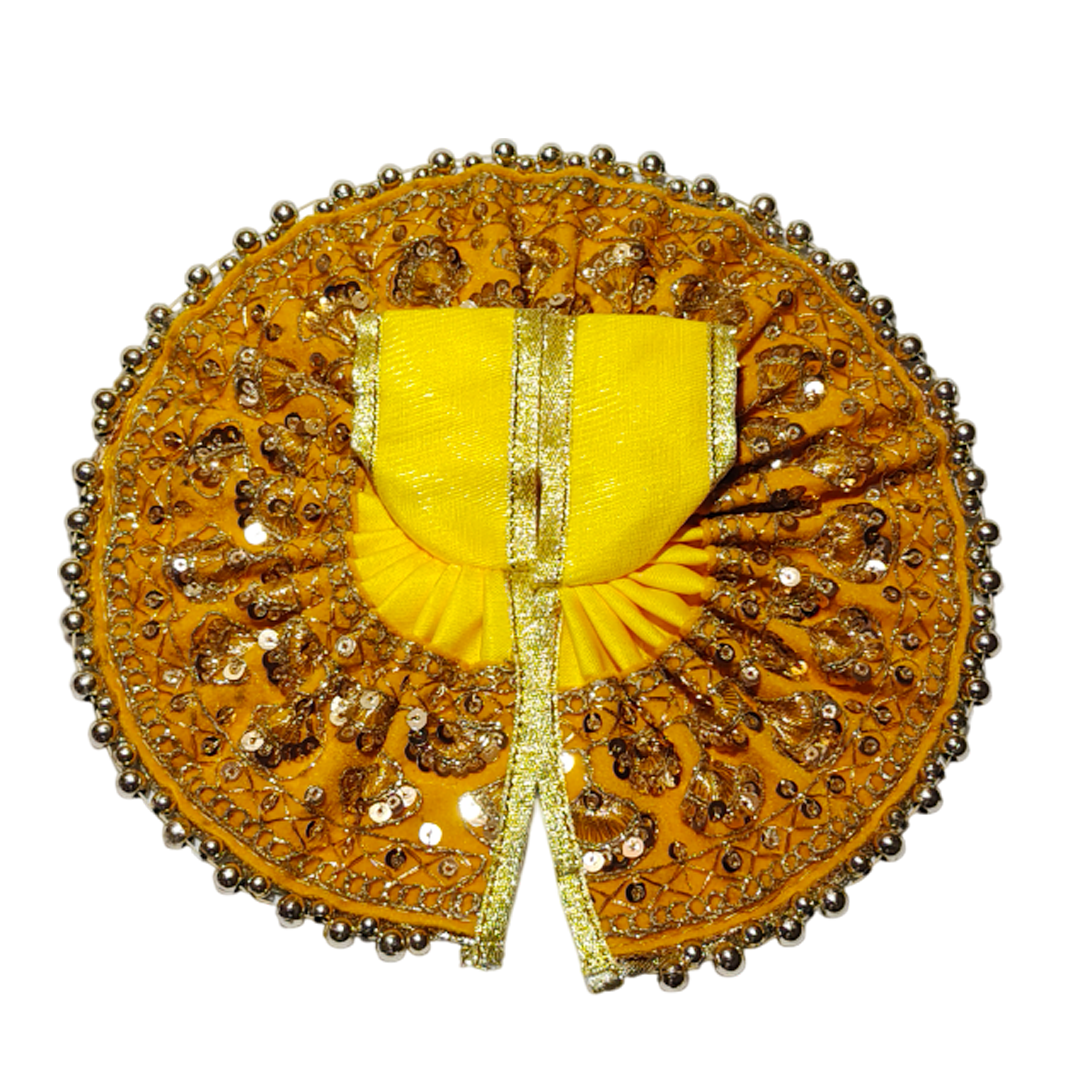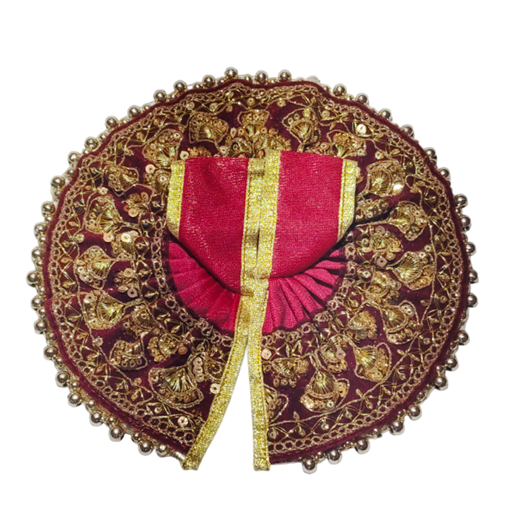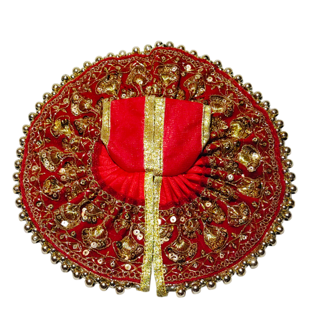Featuring a graceful round-cut design and embellished with delicate stonework and scalloped borders, this dress is perfect for daily darshan, festivals, and pooja rituals. Available in a wide range of colors and sizes from 0 to 8, it’s designed to suit every form of Laddu Gopal.