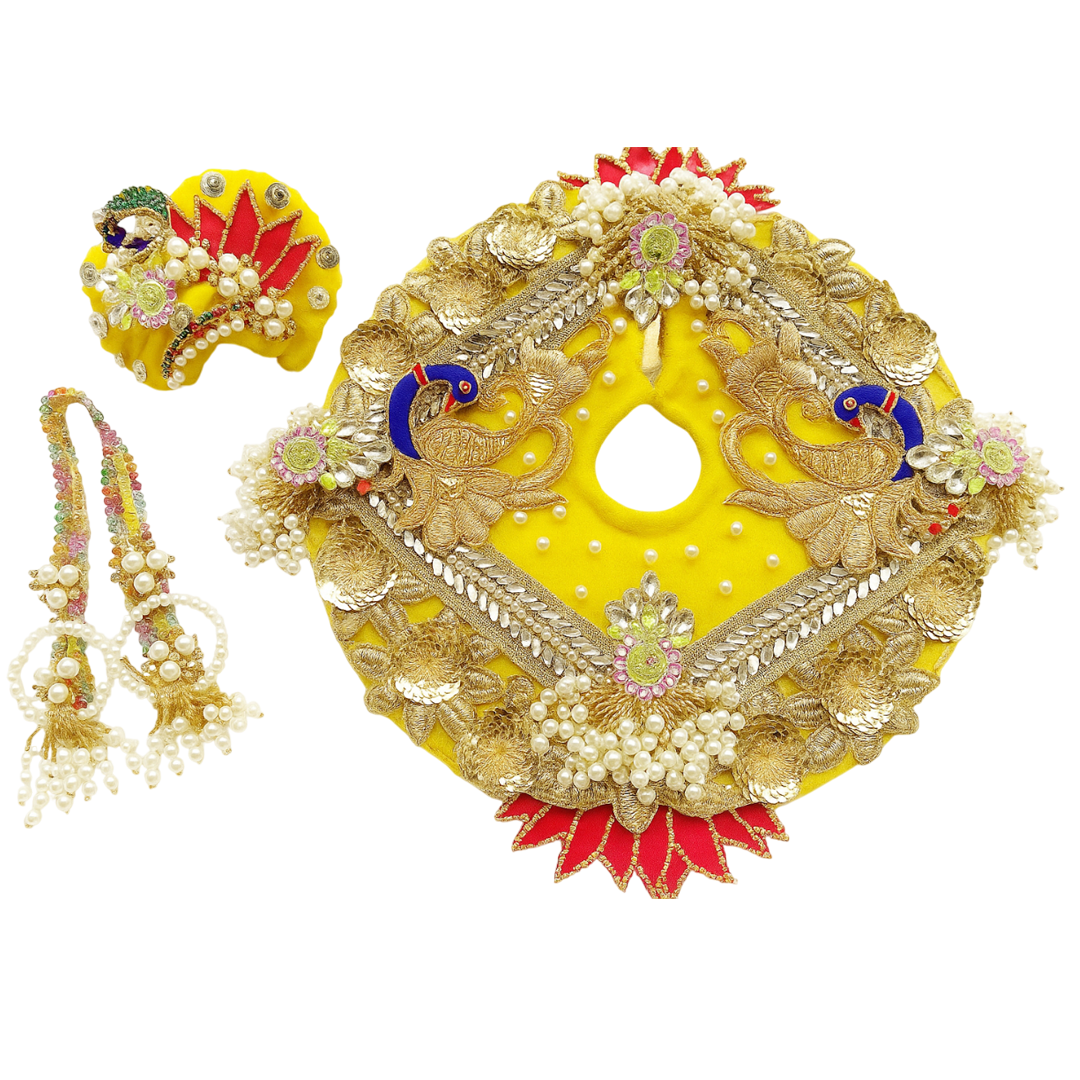 Adorn your beloved Krishna Ji in this majestic poshak that blends regality with devotion. This ensemble features vivid yellow velvet fabric, intricately embroidered with peacock motifs, detailed pearl and zari work, and complete adornments to enhance the divine appearance.